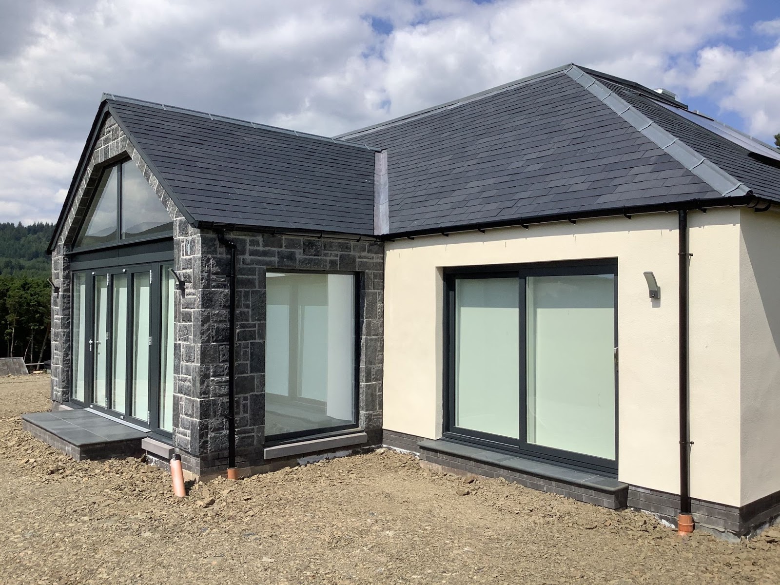 New single storey bungalow built near Ettrickbridge as a new farmhouse. It is a traditional timber frame construction complete with aluminium windows and doors. It is heated via a ground source heat pump and has been very tastefully finished by the clients.